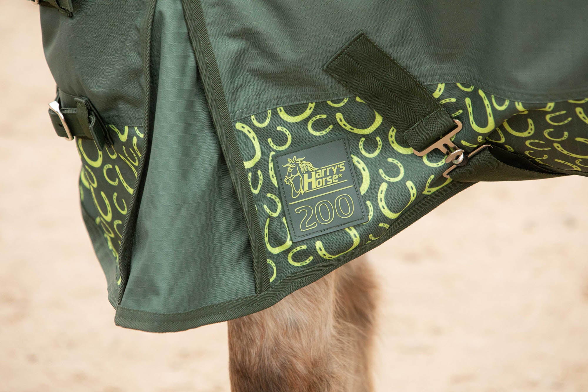 Outdoordeken met polyester voering. Naadloos op de rug, 200g polyfill vulling. Voorzien van loopsplit en staartflap. Dubbele snelsluiting, kruissingels en afneembare bilkoorden. Gevouwen coupenaden, getapete zijnaden.