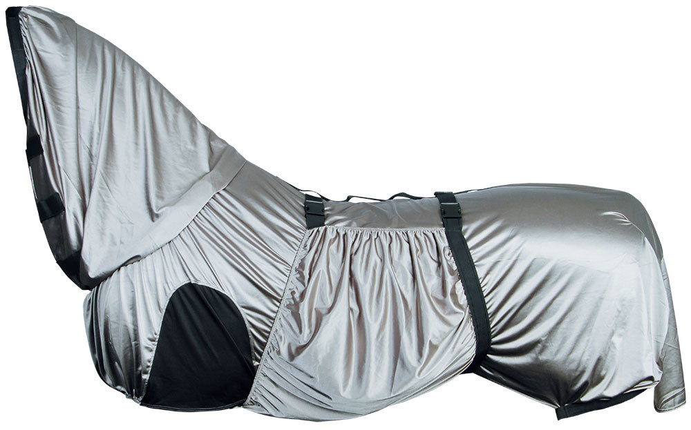 Zilverkleurige eczeemdeken die volledige bescherming biedt tegen vliegen, dazen en andere insecten. Met een goede bescherming tegen UV straling door de UV werende stof. De deken heeft een verstelbare vaste hals en buikflap waardoor het paardenlichaam goed beschermt wordt tegen vliegen en andere insecten.