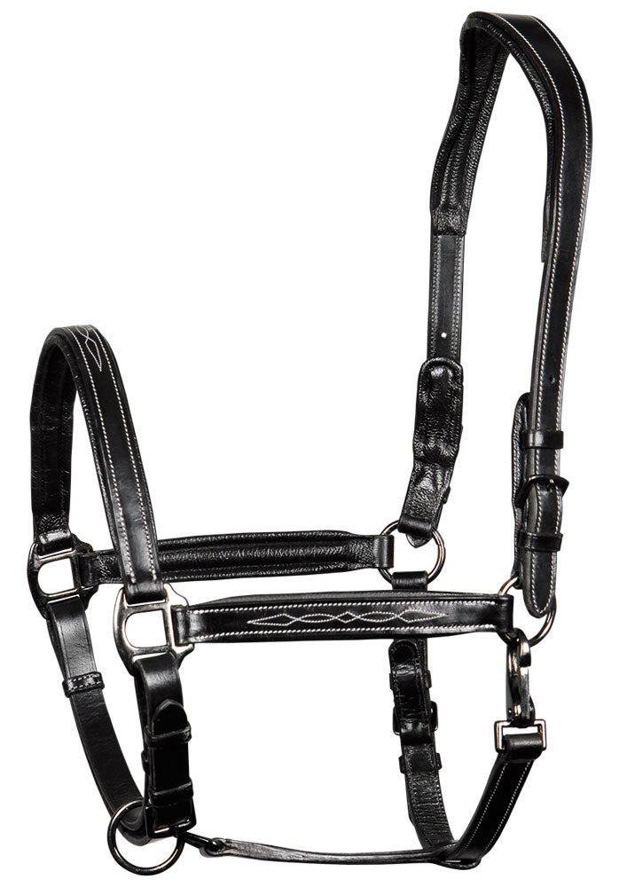 Dubbel verstelbaar lederen halster. Door de elegante smalle riempjes is dit een zeer fijn halster, erg soepel en zacht onderlegd.
