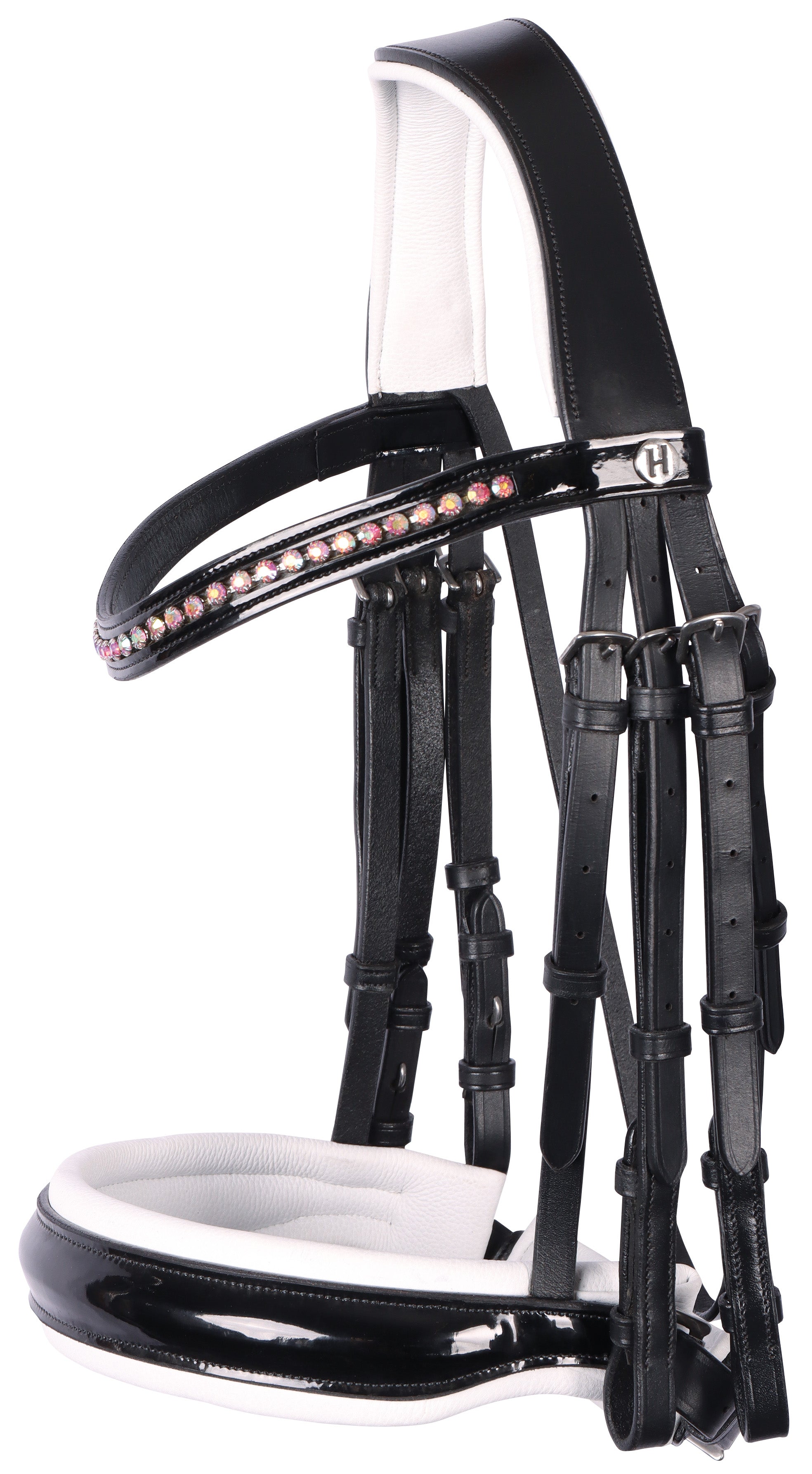 Luxe lederen S&T hoofdstel met aansnoerneusriem. De luxe, brede lak-neusriem is 4CM breed (incl. witte padding) en is anatomisch gevormd rond het bit. Met speciaal, anatomisch, zacht onderlegd kopstuk. Elegante smalle riempjes voor onder andere de keelriem. Uitgevoerd met luxe, hangende frontriem met lak en schitterende AB-kristallen. Blinde sluitingen aan bakstukken en teugels.