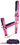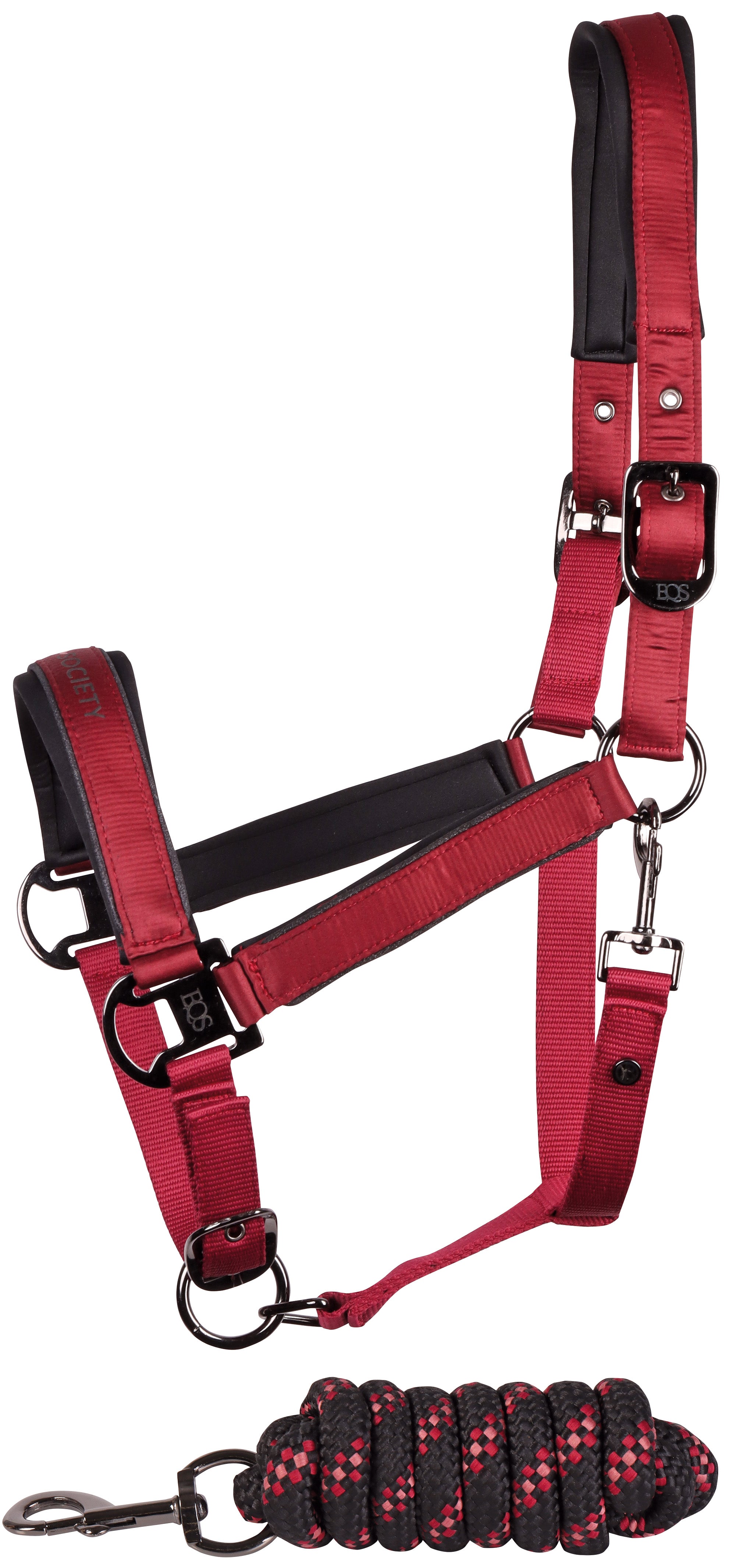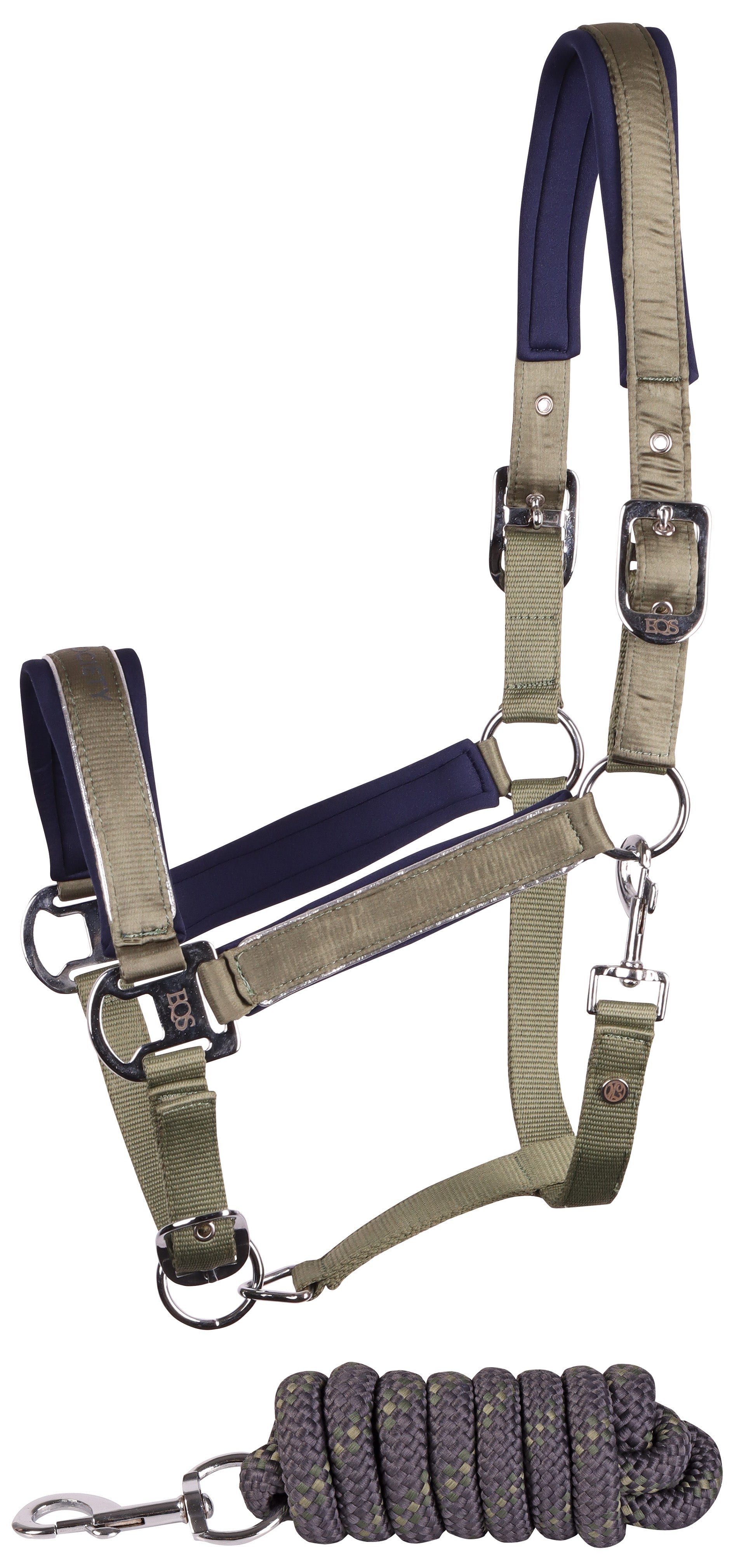 Halsterset met satijn bekleed en een glitter piping op de neus en kaakstukken, neopreen onderlegd, verstelbaar aan twee kanten van het kopstuk en op de neus, inclusief een halstertouw van 2 meter lengte.
