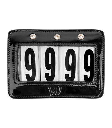 Competition numbers made of soft patent leather with beautiful rhinestones. Simple changing of competition numbers. Adjustable from 1-9999. Easy to attach to the saddle pad with a large safety pin. Pair