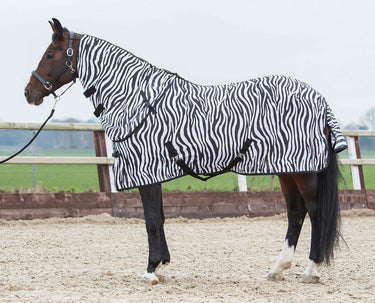 Vliegendeken met afneembare hals en zebraprint. De hals en de deken zijn eenvoudig en snel te sluiten door clipsluitingen. Inclusief kruissingels en bilkoorden.