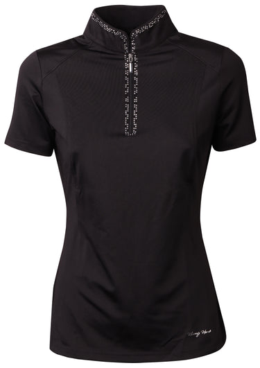 Wedstrijdshirt met korte mouw en een opstaande kraag met korte ritssluiting. De kraag en de ritssluiting zijn rondom gedecoreerd met kristallen.