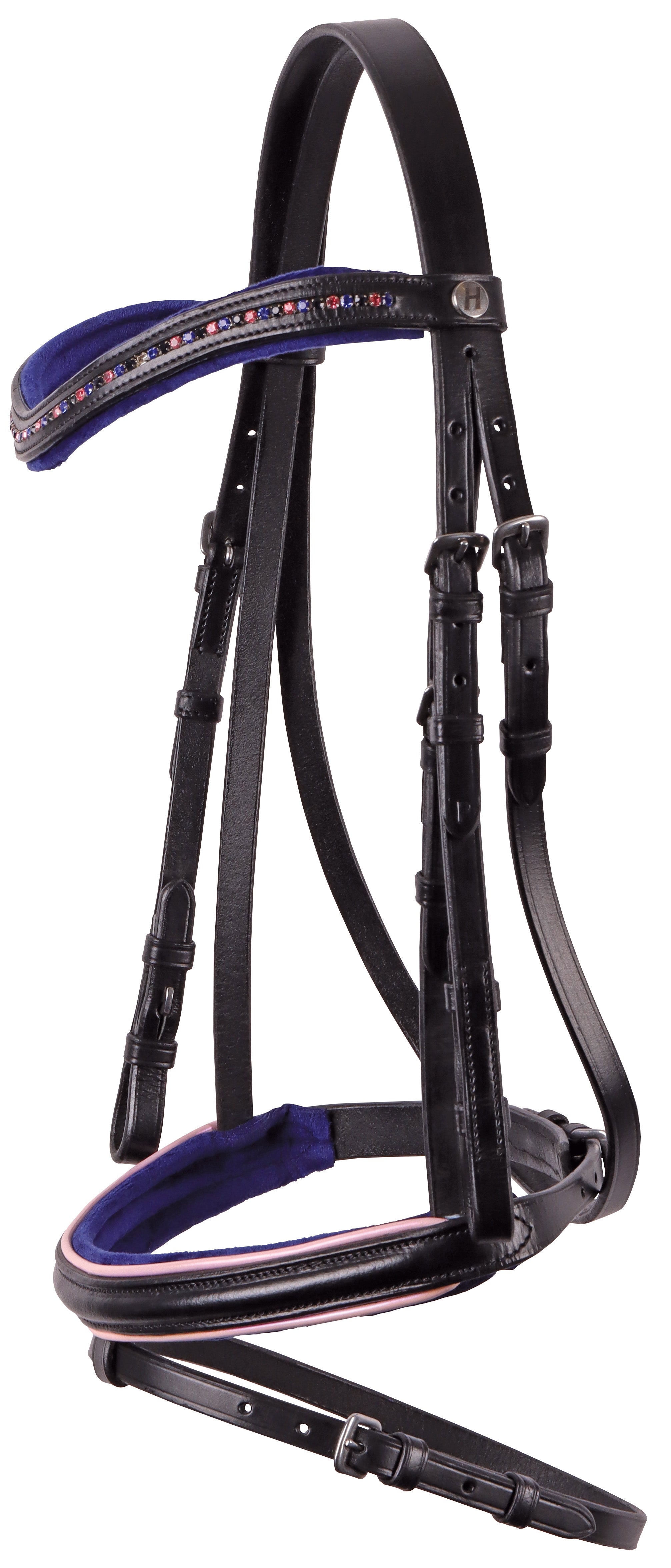 Leder hoofdstel met glimmende piping op de neus en kleurrijke kristallen op de frontriem en inclusief webbandteugels.