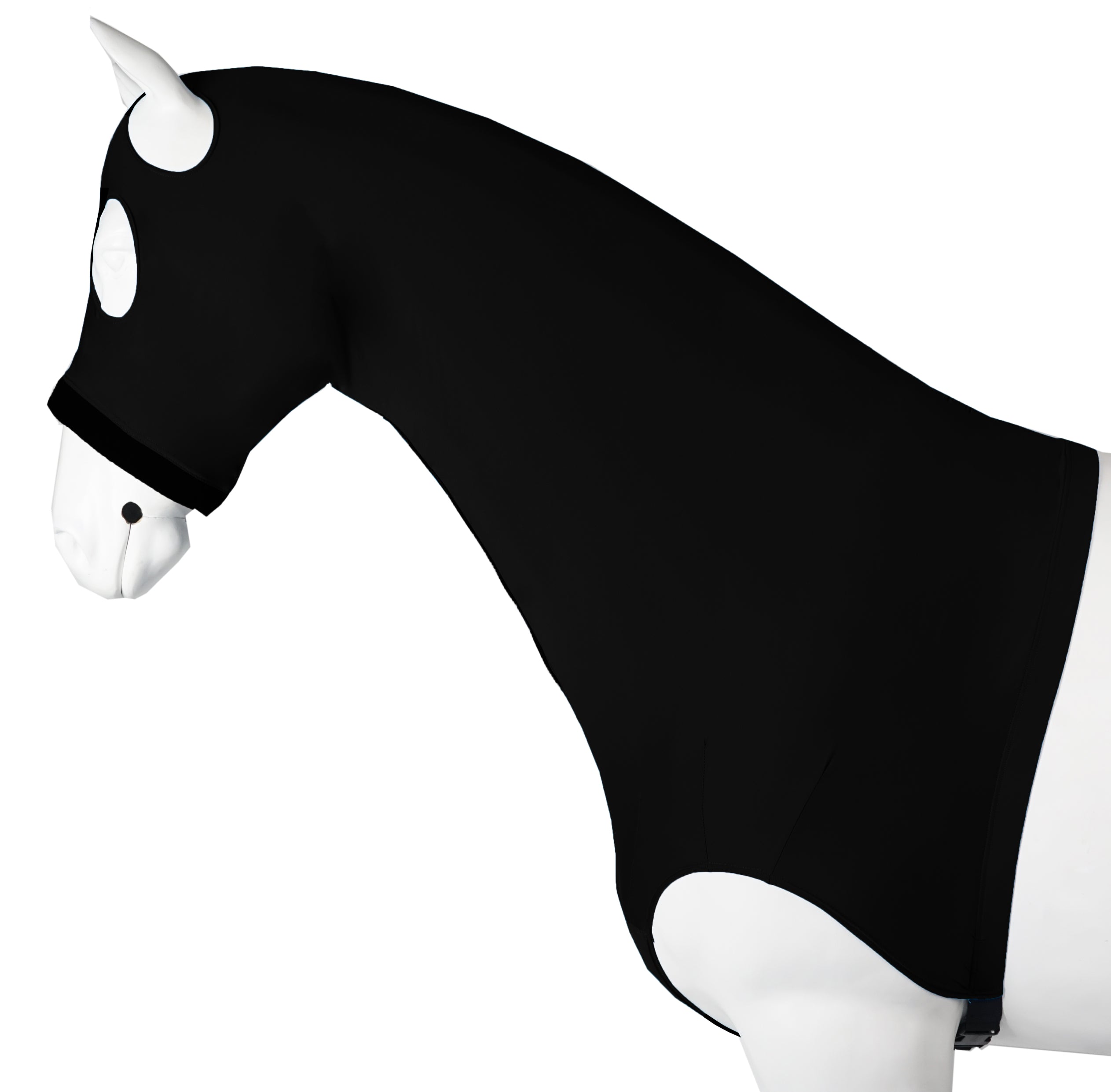 Lycra hals met masker. Productspecificaties: Bedekt de borst de nek en het hoofd van het paard Bevat uitsneden bij de ogen en oren Beschermt tegen het schuren van een deken Houdt de borst de nek en het hoofd schoon Inclusief een verstelbare elastische band met een snel sluitingssysteem Sterk rekbaar 15% lycra 85% polyesterstof Rits in het nekgedeelte Fleeceafwerking rondom de neus Maten: S: Pony M: Cob L: Full XL: X Full