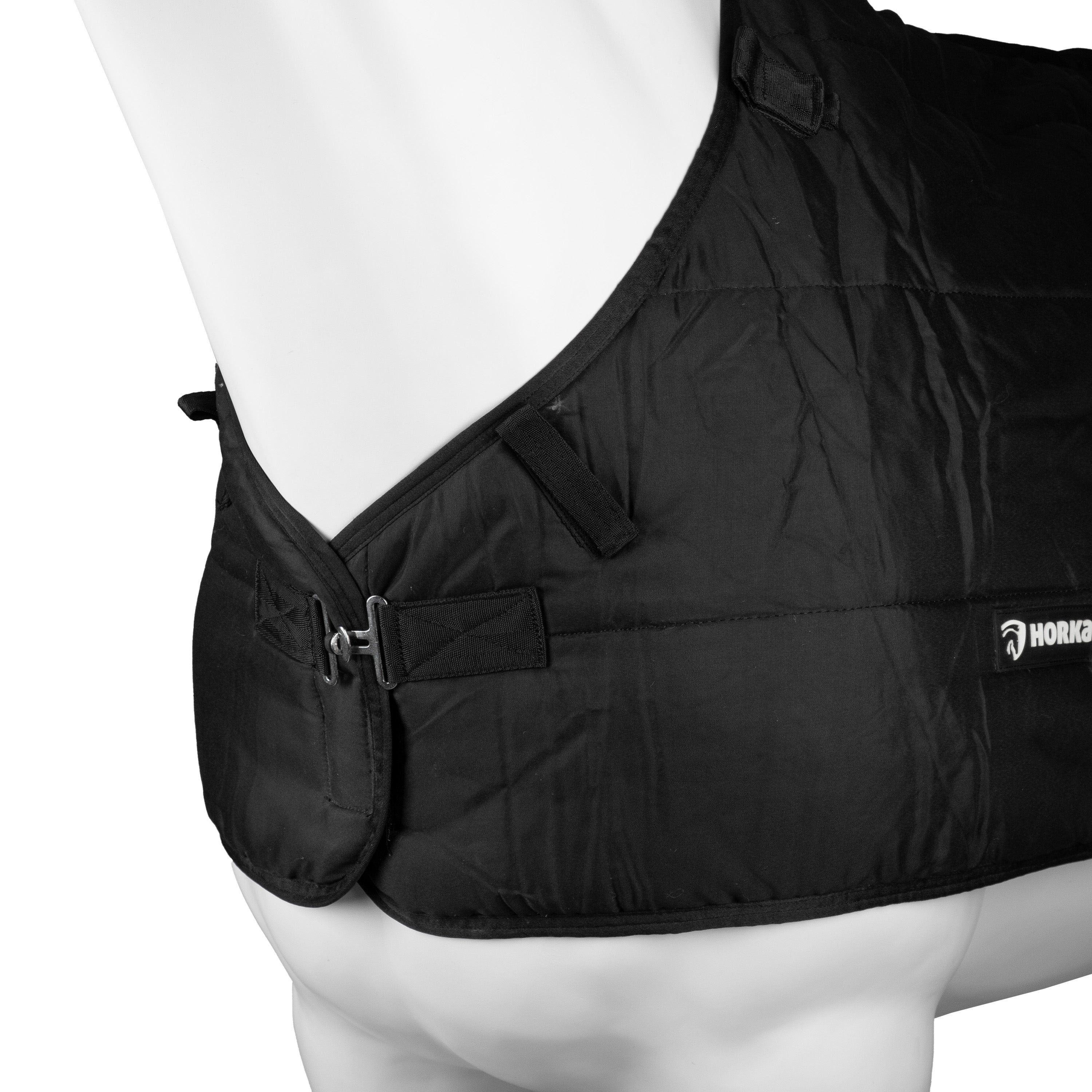 Onderdeken van soft polyester (blauw) Productspecificaties: Voering van polyester 100 gram vulling Surcingle voorsluiting met klittenbandsluiting D ringbevestigingen voor beenbanden Met fleece gevoerde schoft Klittenbandlus op de schoft om het onderdeken aan een buitendeken te bevestigen.