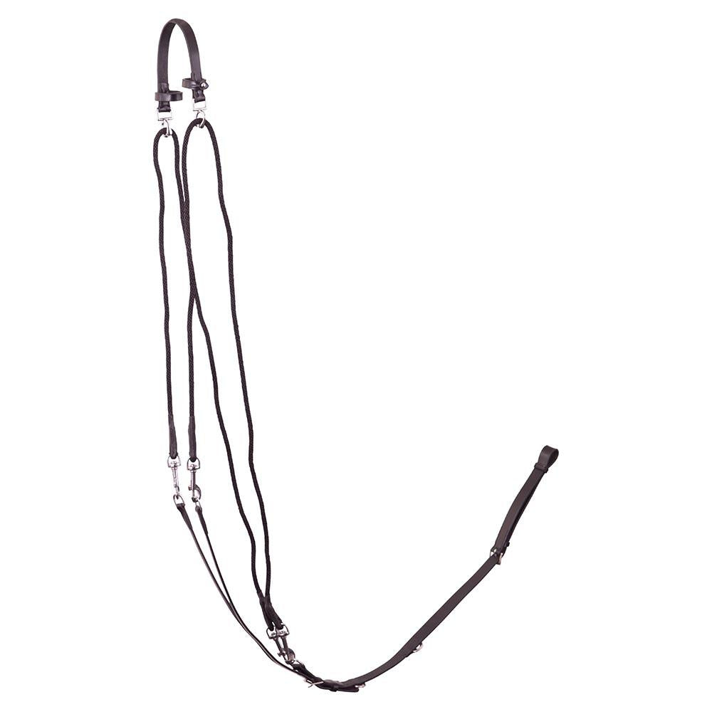 Lederen gogue met verstelbare singellus voorzien van gespsluiting en drie D-ringen, waarvan één aan het uiteinde en twee op het borstdeel voor meer verstelbaarheid. De zachte nylon koorden worden bevestigd met musketons en lopen via de bitringen naar de ringen (voorzien van rollers) aan het lederen kopstuk en weer terug naar het borststuk van de gogue waar ze weer met een musketon bevestigd worden aan één van de drie D-ringen. Er wordt een driehoek gevormd, waardoor het paard de hals minder naar voren strekt. De gogue is voorzien van roestvrijstalen fournituren. De gogue is te gebruiken tijdens het rijden en longeren en zorgt ervoor dat het paard meer nageeflijk wordt en in een ontspannen aanleuning loopt. Als het paard zijn hoofd opricht, komt er druk achter de oren en in de mondhoeken waardoor het paard zijn hoofd weer omlaag zal brengen.