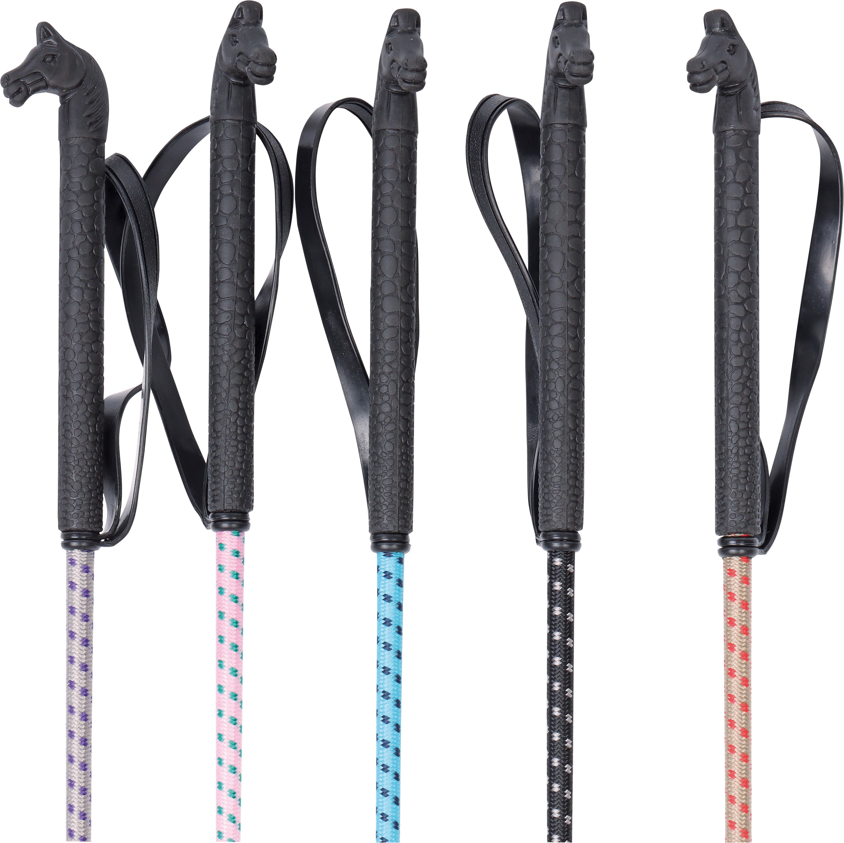 Rubber handvat met paardenhoofd en polslus, nylon gevlochten steel en flapper aan het uiteinde.