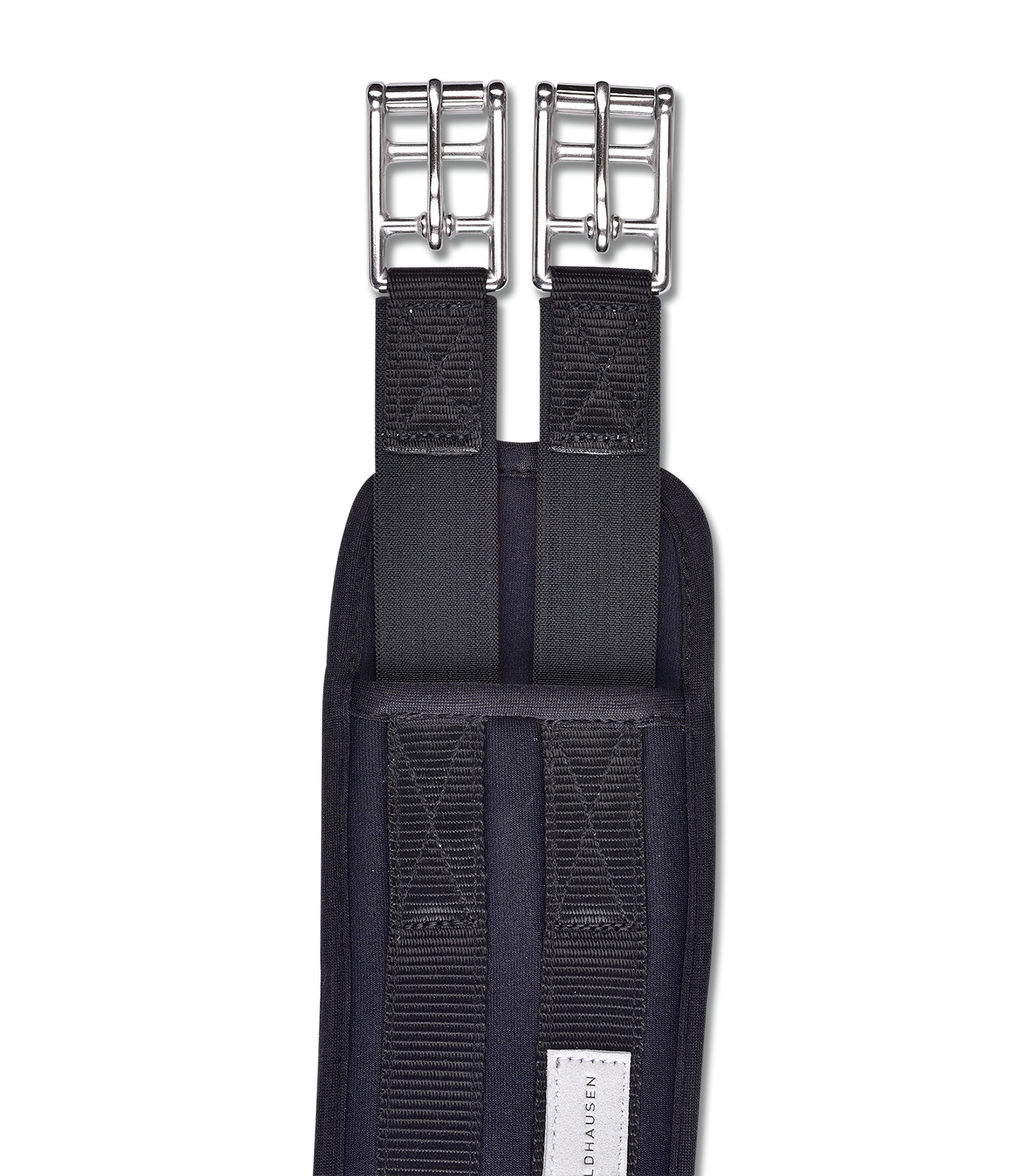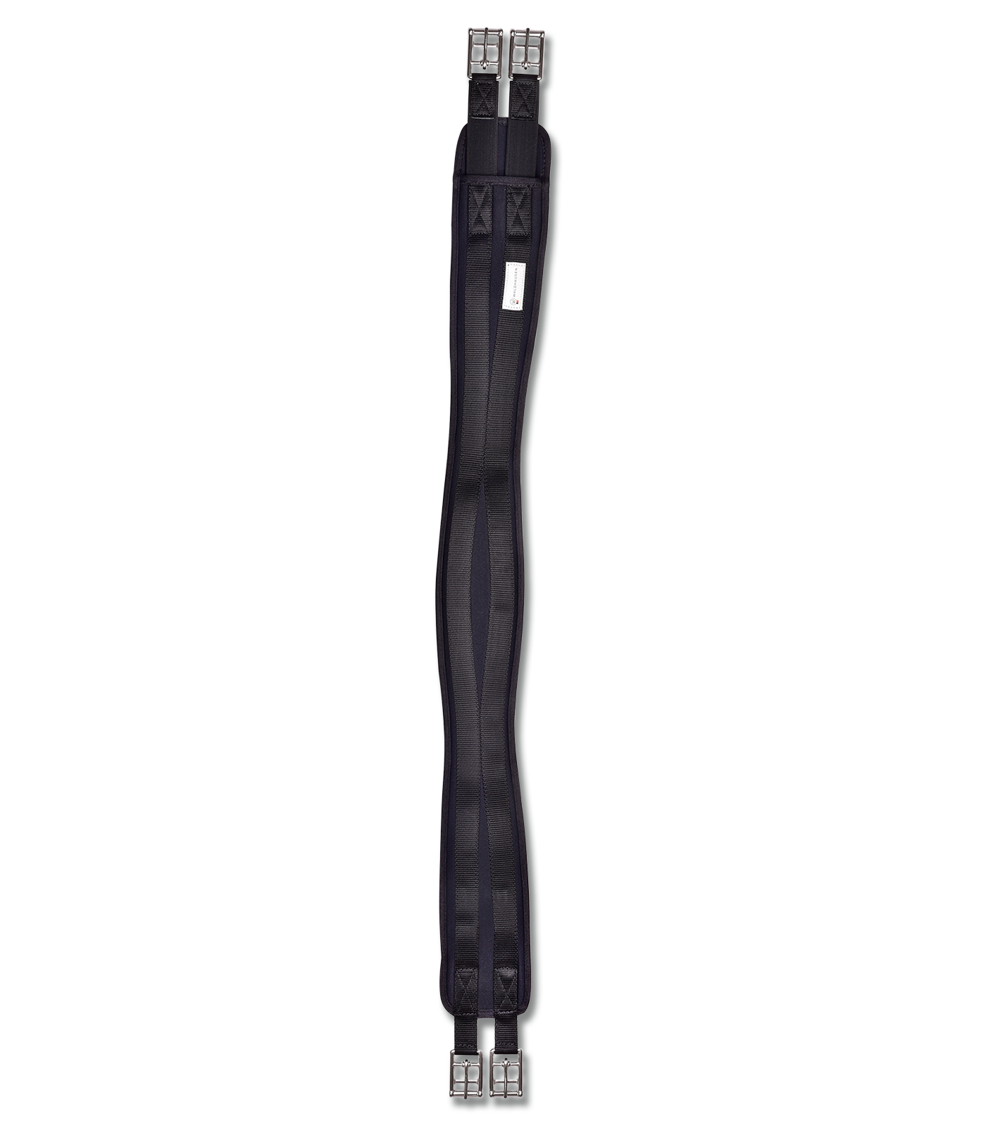 This anatomically shaped girth is made of skin-friendly material and prevents pressure points. Integrated gel-insert and elasticated on one side. Stainless steel roller buckles.