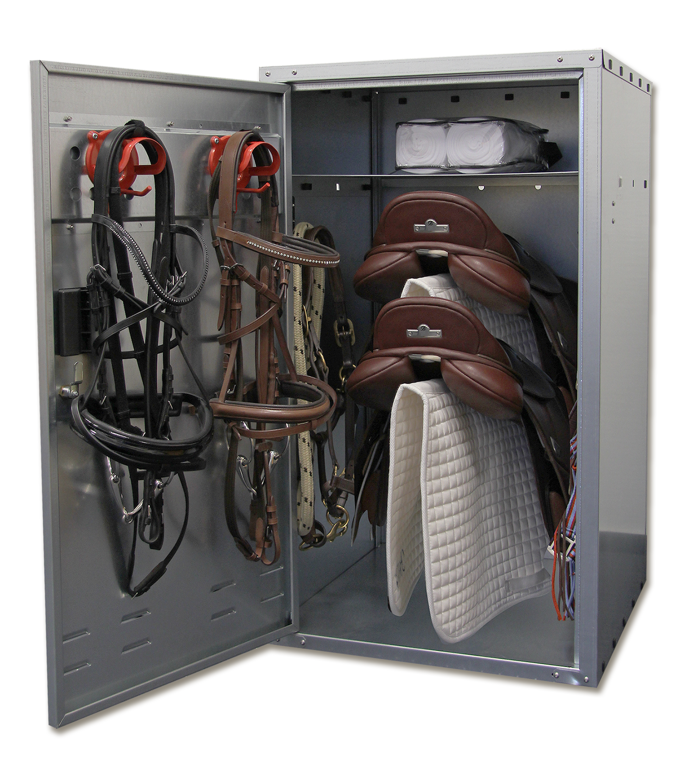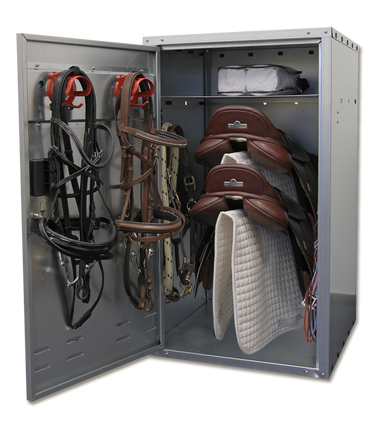Saddle locker for self-assembly. Easy to construct with instructions, suitably packaged for transport. Can be delivered by courier. Features two saddle racks, two bridle hooks and hooks for small items as well as a storage compartment.