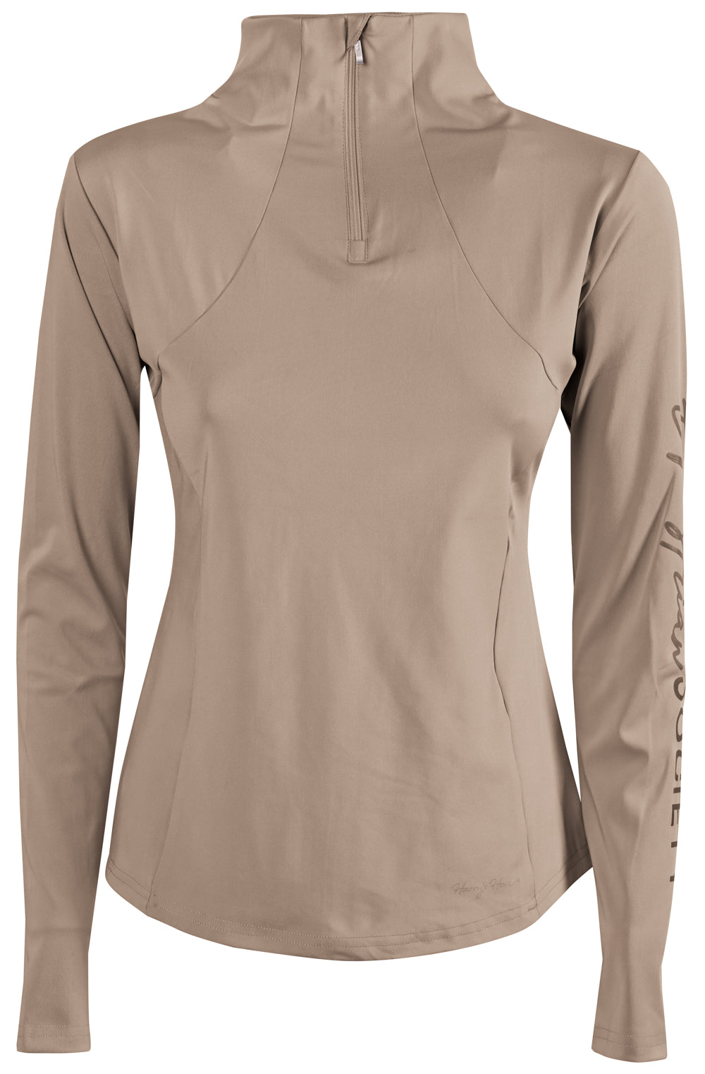 Shirt met lange mouw, opstaande kraag met korte ritssluiting en het Equestrian Society logo op de linkermouw.