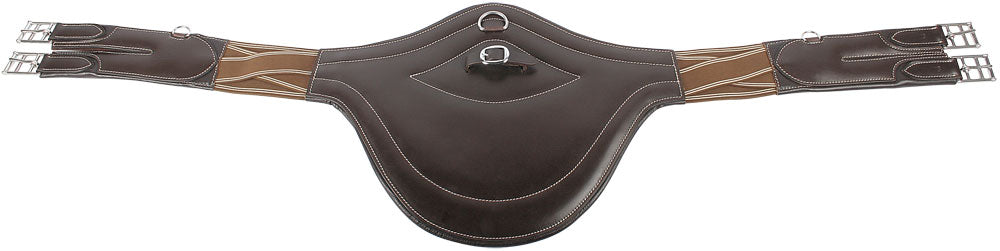 Lederen buikflapsingel met rundlederen voering. Beide zijden met elastiek aan het begin van de singelstoten voor extra bewegingsvrijheid bij de buik. Met rvs rolgespen en D-ring op buikflap (voor hulpteugels).