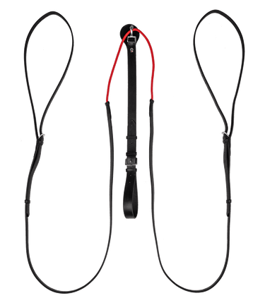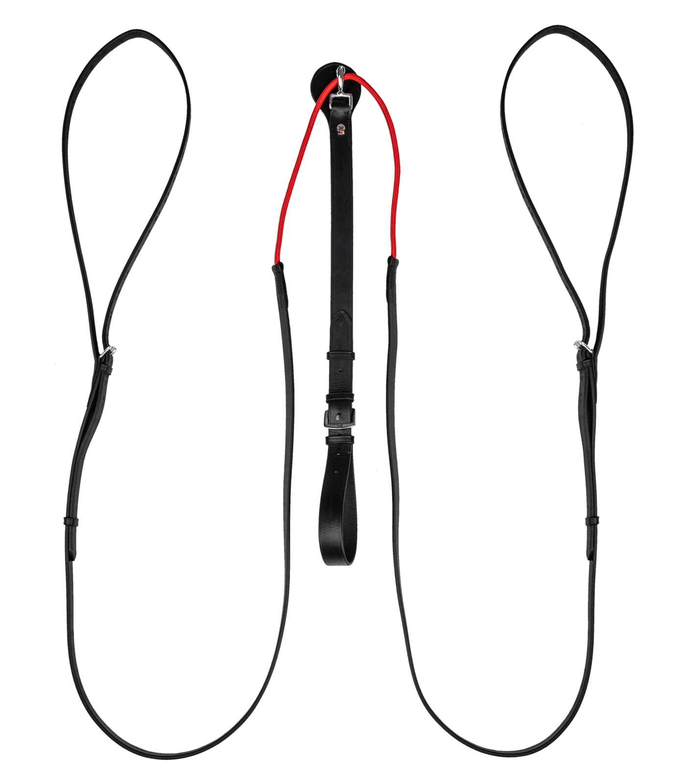 Innovative length-adjustable and flexible leather triangular reins for riding or lunging. The W-trainRein triangular reins are attached to the saddle girth or lunging girth between the front legs. A special rein runs through a pulley and is guided from there through the bridle rings (from the inside to the outside) back to the saddle girth or lunging girth. The pulley allows the reins to yield and facilitates gentle and mouth-friendly bending and exercising while riding or lunging.