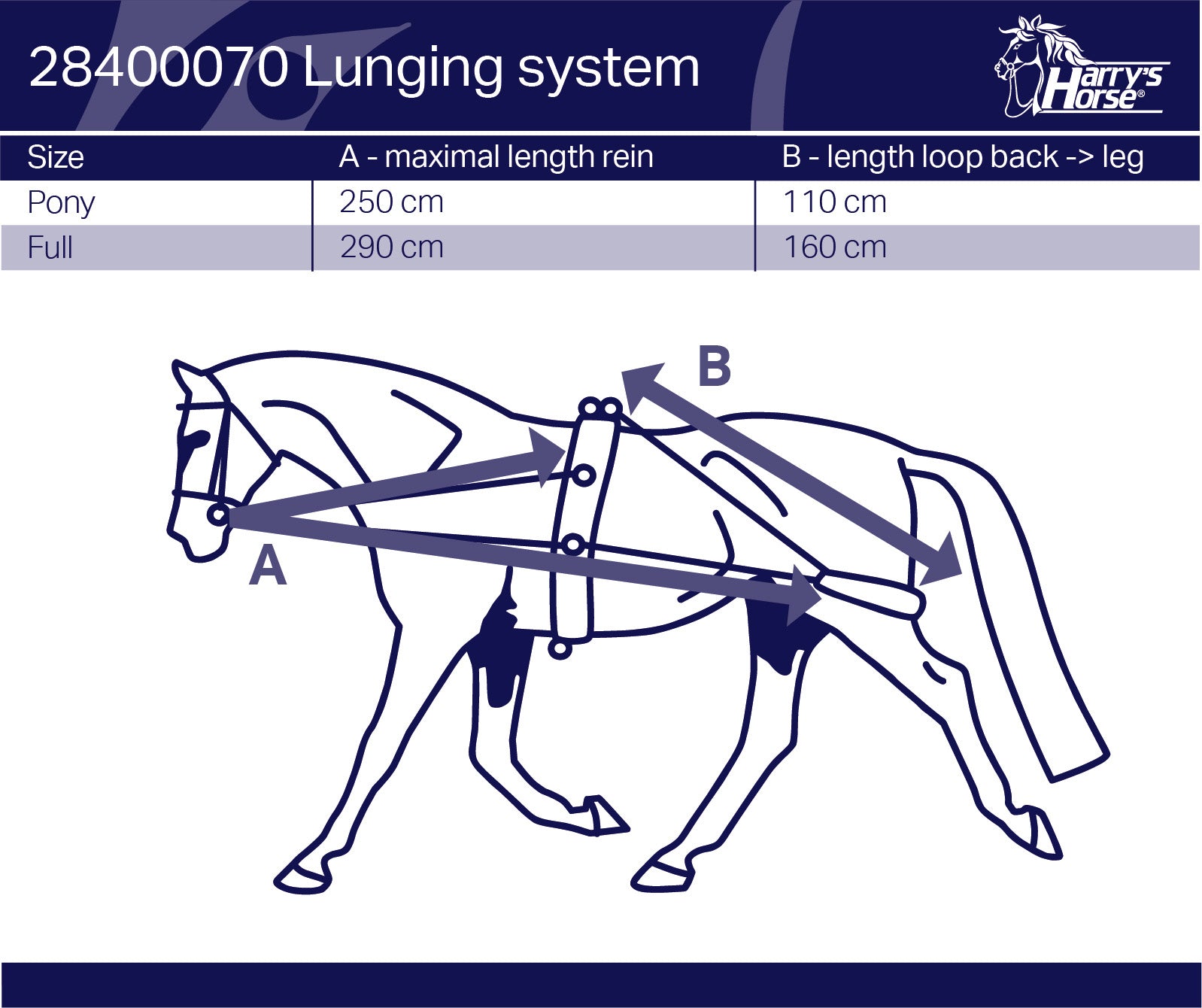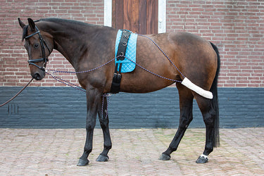 De longeerhulpteugel is een revolutionair trainingsmiddel voor paarden dat de rug sterkt, de boven lijn van het paard stretcht en het paard voorzichting aandringt om correct te lopen. De longeerhulpteugel moet worden gebruikt in freqeunte korte sessies voor het beste effect.