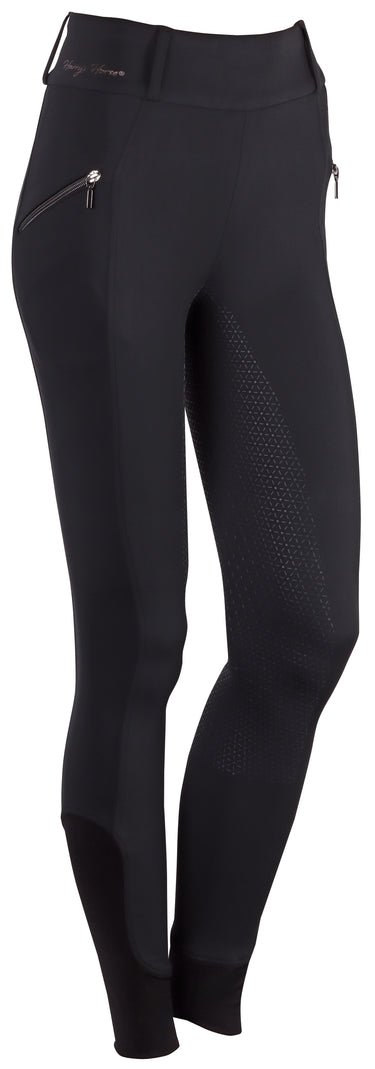 Paardrijlegging met een hoge tailleband met riemlussen waarvan een brede met kristallen op de achterkant, twee steekzakken met kristallen, zitvlak met een siliconen print voor extra grip in het zadel en een elastische inzet bij de enkels voor meer comfort in je paardrijlaarzen.