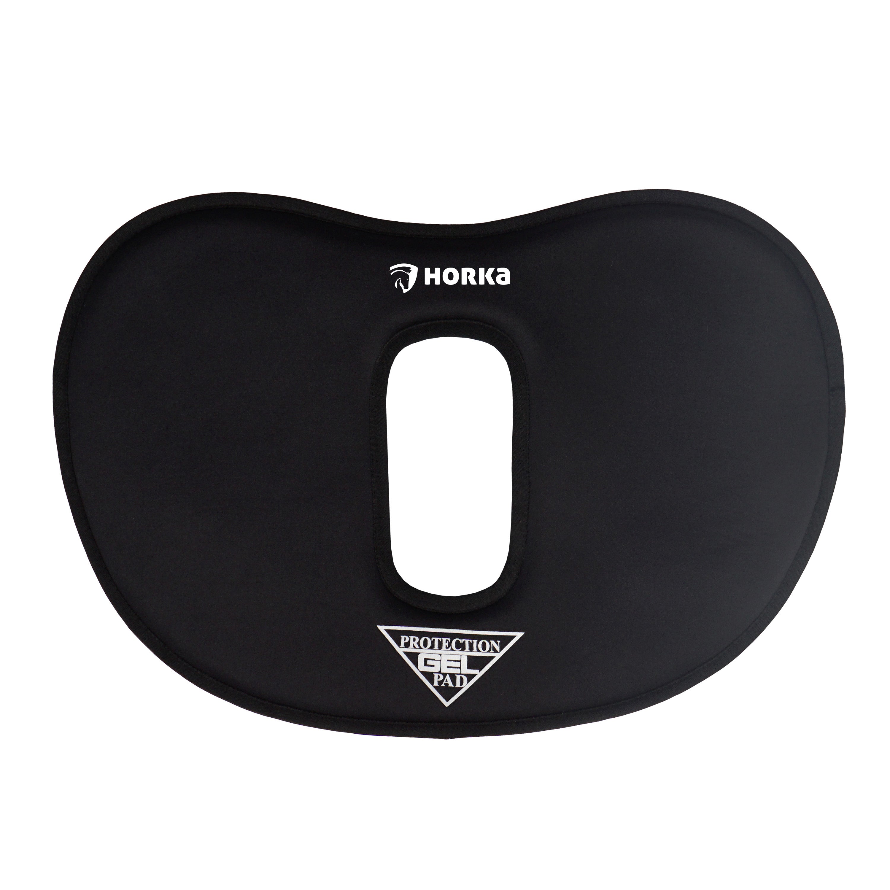 Ronde schokabsorberende zadelonderlegger met uitsparingen. De zadelonderlegger zorgt voor een betere drukverdeling en is gemaakt van PU memory gel foam. Afmeting: 30 x 47 cm Materiaal: PU memory gel foam en polyester
