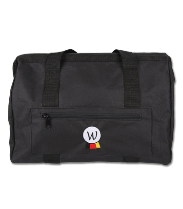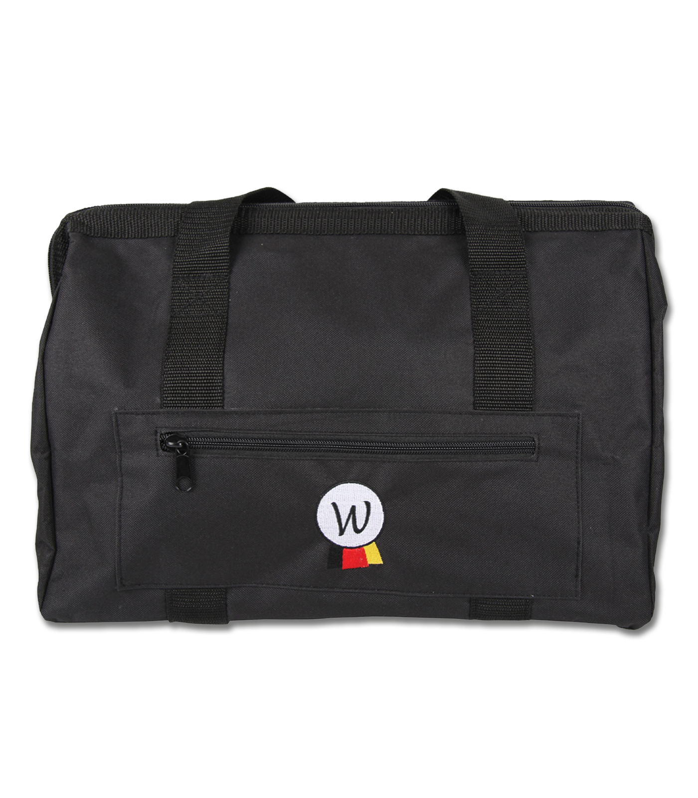 Practical storage bag with attached zip pocket and divided interior. With opening frame and fixed base.