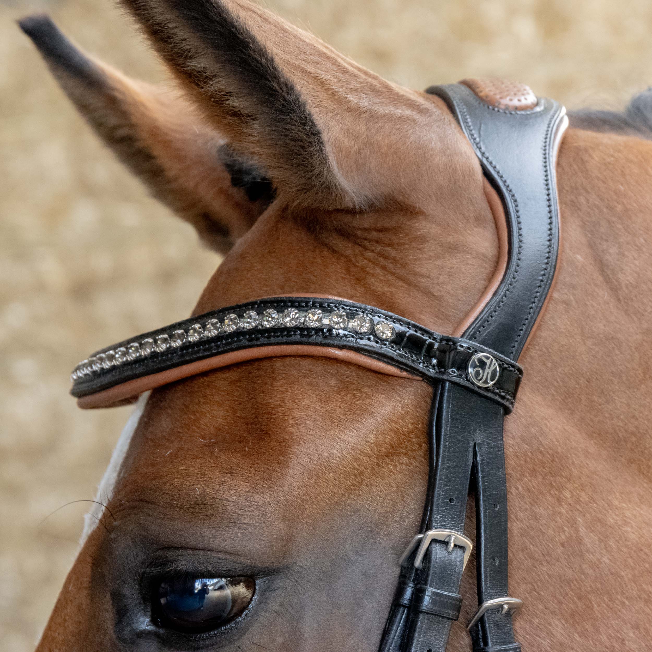 Lederen hoofdstel met anatomisch gevormd kopstuk en aansnoerneusriem. Afgewerkt met croco lak op neusriem en frontriem. De frontriem is ingelegd met cognackleurige kristallen en het hoofdstel is onderlegd met cognackleurig leer.