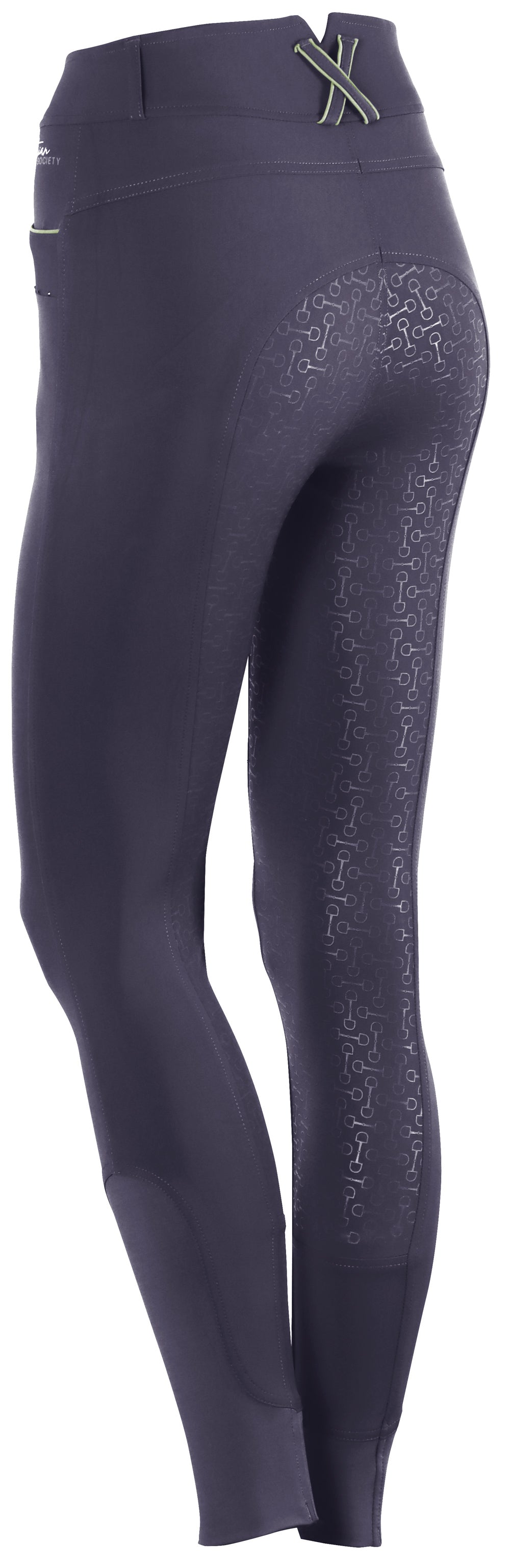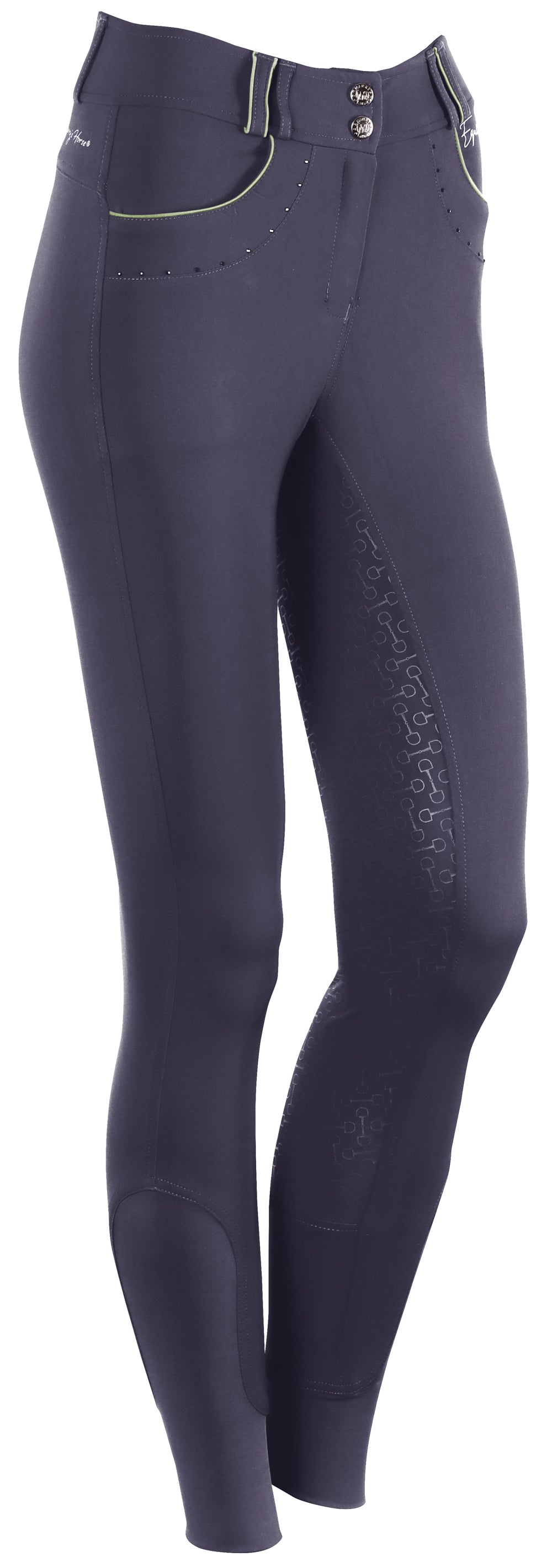 Paardrijbroek met twee steekzakken voorzien van een glitter piping en gunmetal kleurige kristallen, glitter piping op een aantal riemlussen, siliconen print op het zitvlak en een elastische inzet rond de enkels voor meer comfort in je paardrijlaarzen.